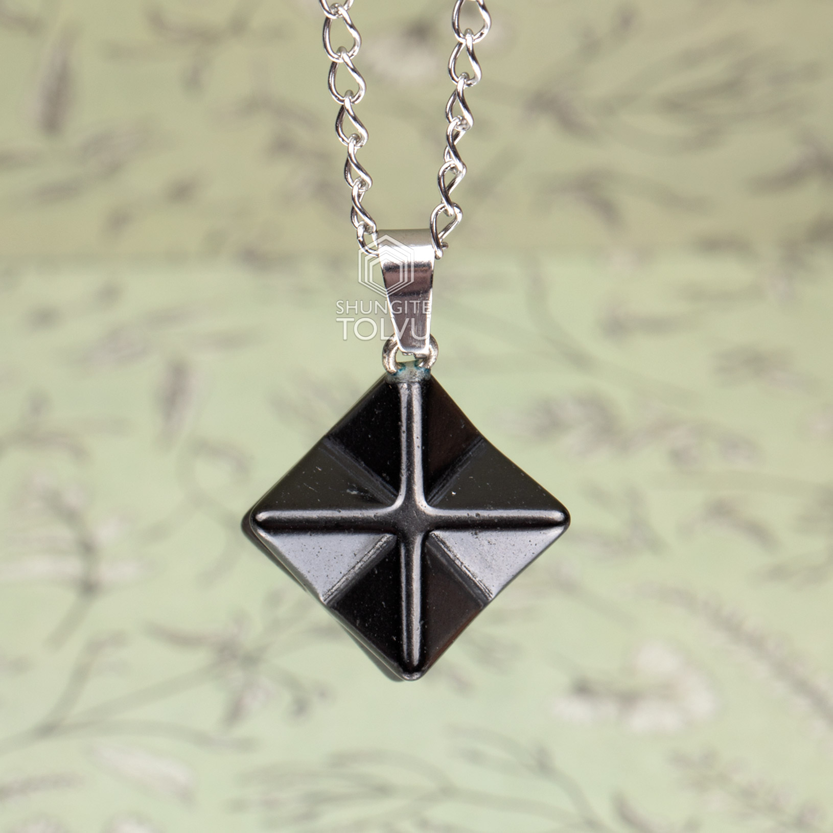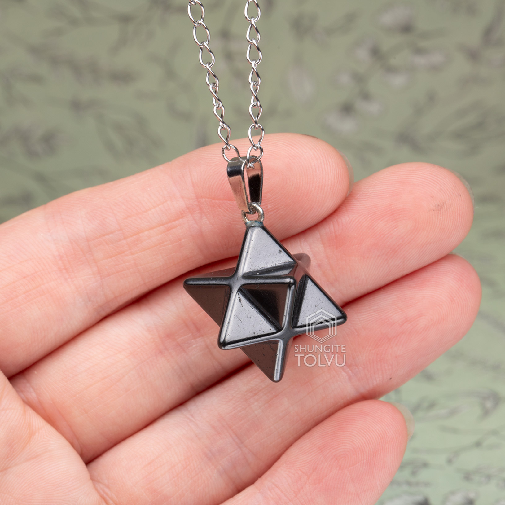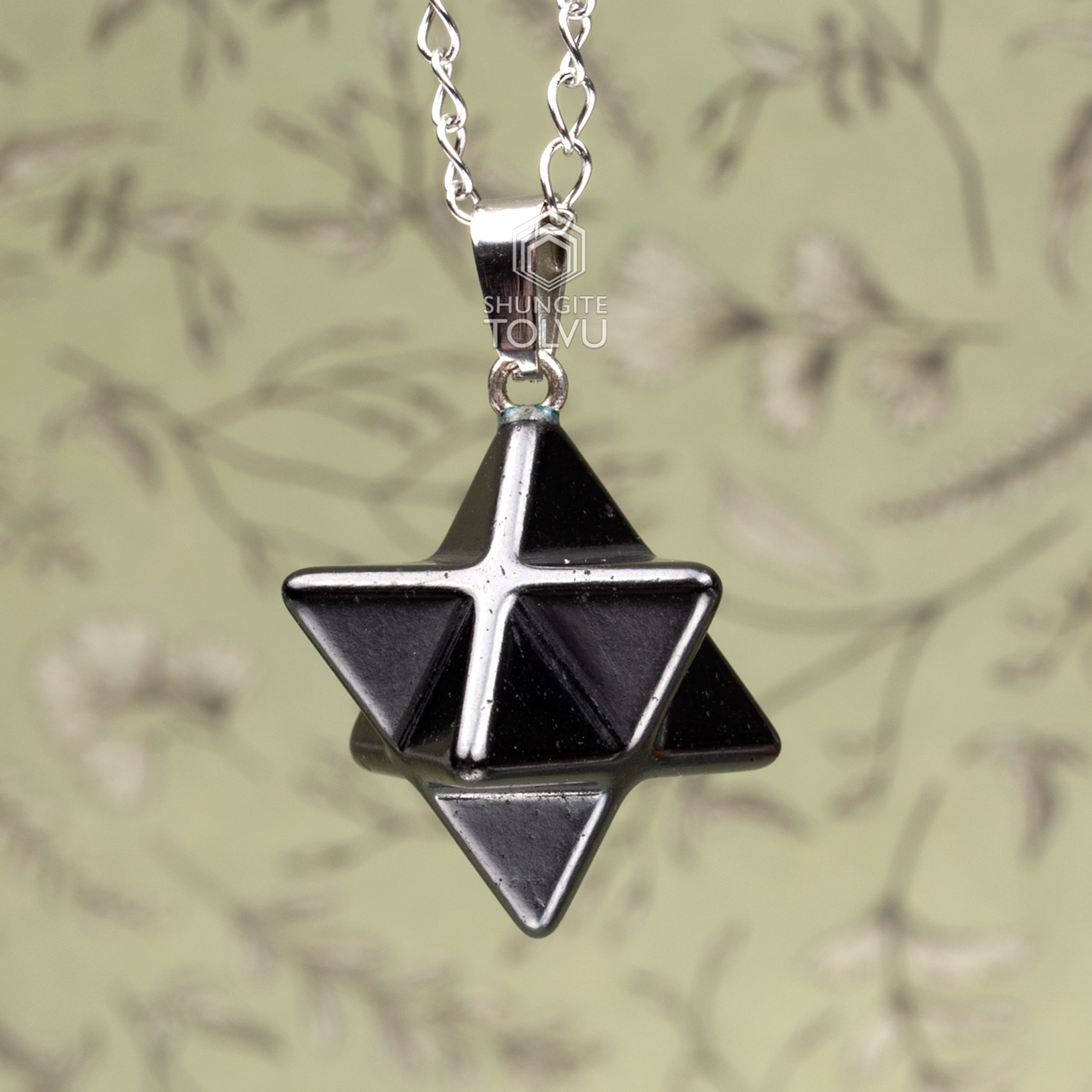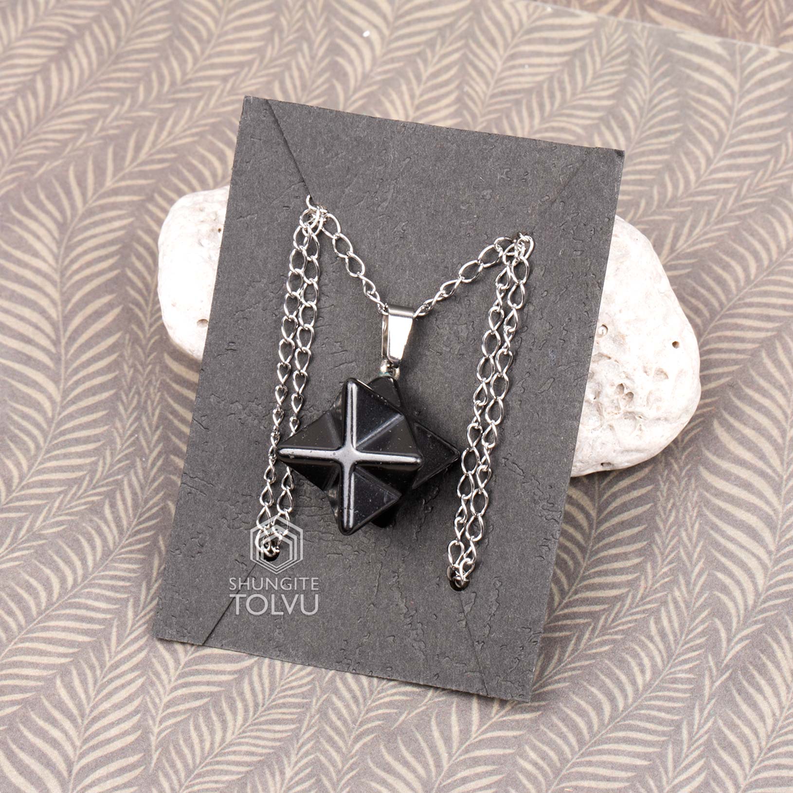 This handmade pendant is carved from authentic shungite stone. The mineral is rare and unique: it conducts electricity like metal and helps shield against EMF and disruptive energy. As a result, many people choose this merkaba pendant as a tool for grounding and energy balance.
