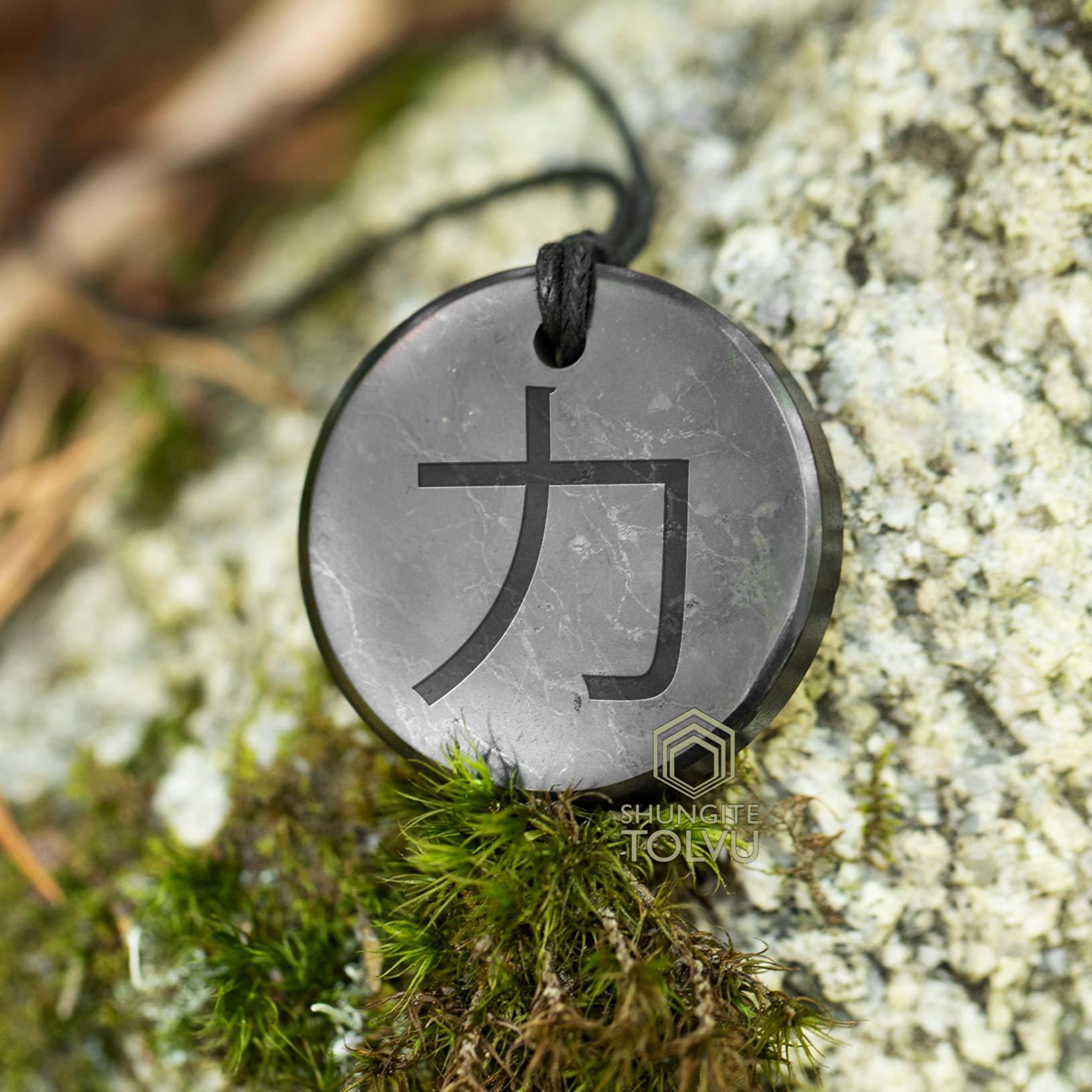 Engraved Chinese strength symbol on a 100% natural shungite pendant (3.5 cm).