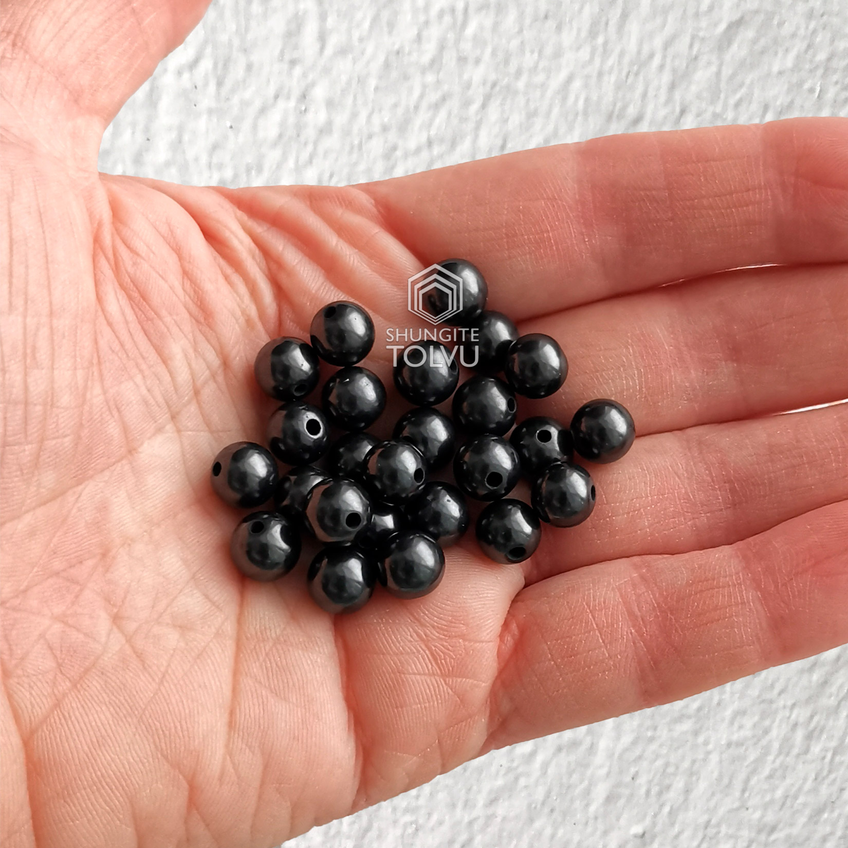 You get 25 pieces of shungite beads in one package. The size of each ball is about 8mm / 0.31 inches. Each bead has a hole about 1mm in diameter.