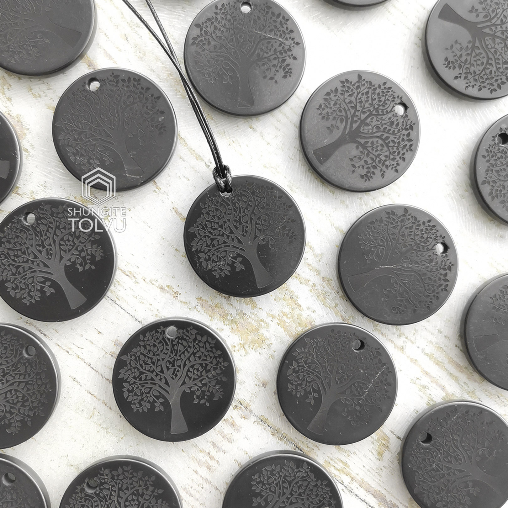 Shungite pendant tree of life engraved image. A string made of waxed cotton complete. Size about 1.4 inches / 35mm. The drawing is made by the method of stone engraving. Such a drawing will never be erased.